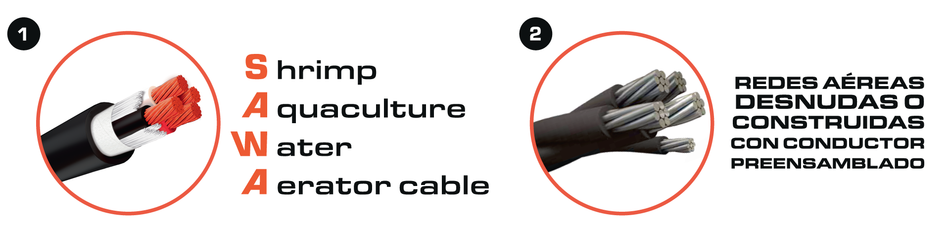 Los conductores multipolares tipo SAWA son utilizados para la alimentación eléctrica de aireadoras usadas en piscinas camaroneras, y otros usos indicados en el National Electrical Code. Este tipo de conductor puede sumergirse permanentemente en agua “viva” (con presencia de microorganismos y especies acuáticas) y a la intemperie. Su temperatura máxima de operación es de 90 °C y su tensión de servicio para todas las aplicaciones es 0.6 kV o 1.0 kV.